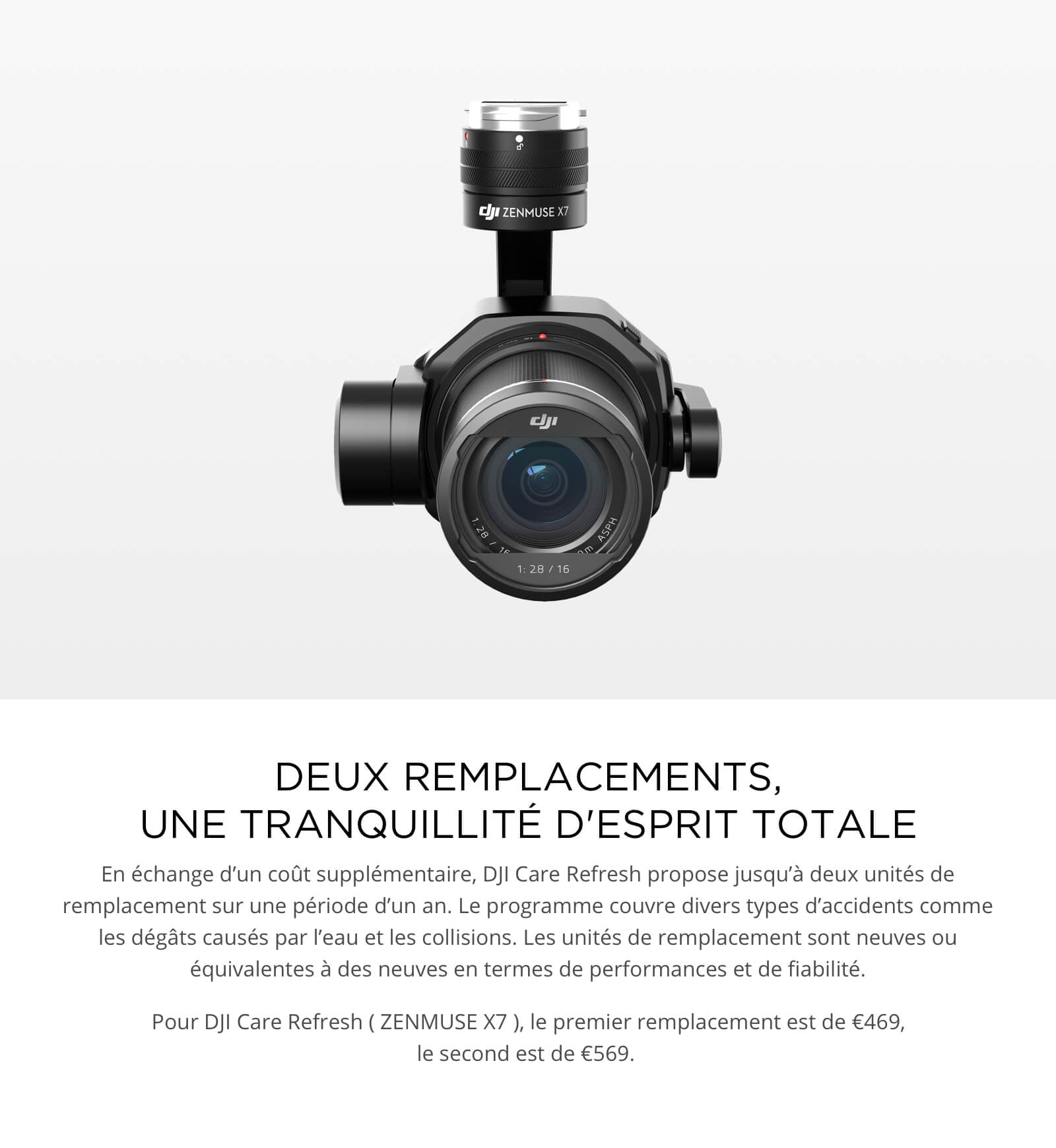 Le DJI Care X7 est un programme de réparation complet pour votre nacelle et caméra. C’est également un moyen de voler en toute sérénité.