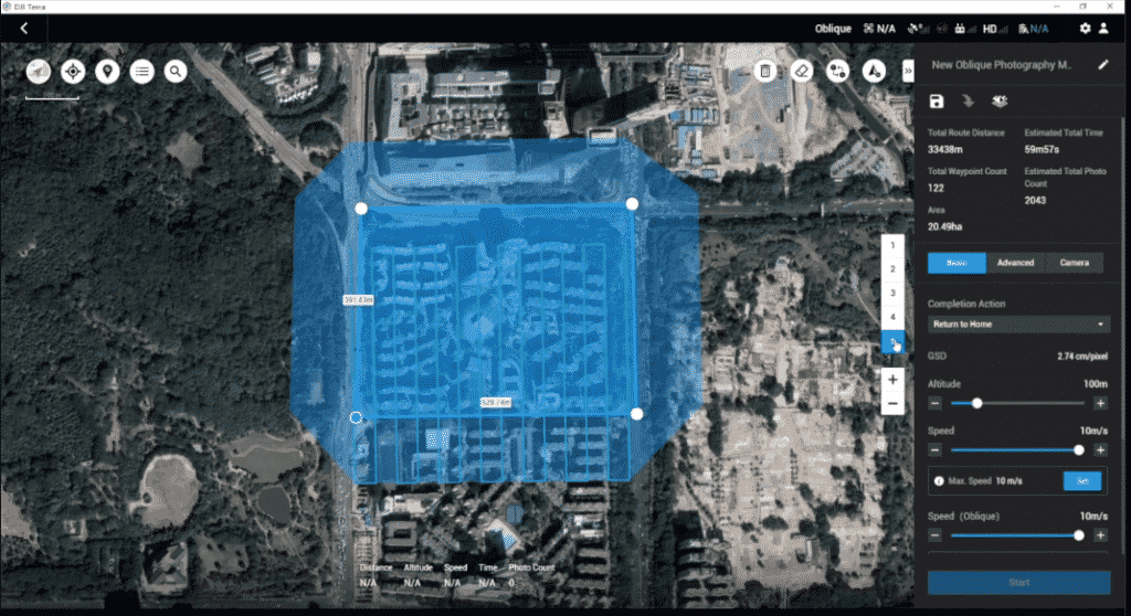 Mission oblique : collectez des images d’une zone sous plusieurs angles de caméra pour reconstruire un modèle 3D.