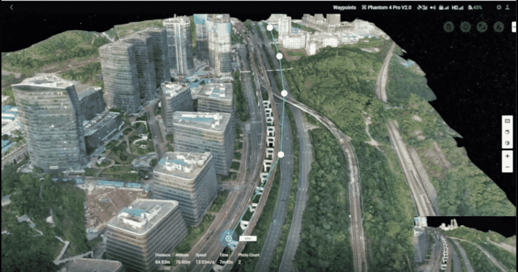 « Waypoints » : créez des trajectoires personnalisées à partir de points de passages prédéfinis (ou waypoints) et de paramètres ajustables tels que l’altitude, la vitesse, l’angle d’inclinaison de la nacelle et le cap du drone.